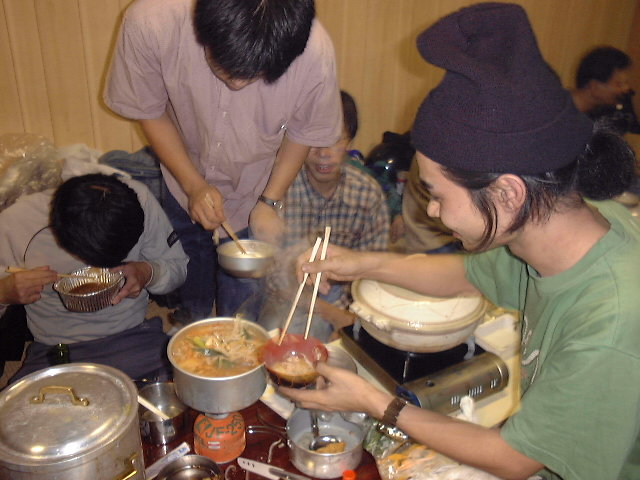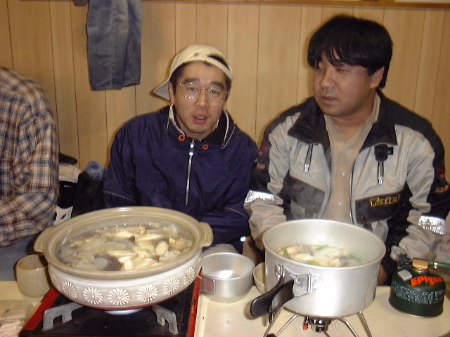 鍋が出来る合間に濡れたGパンをバーナーで乾かすloony。
