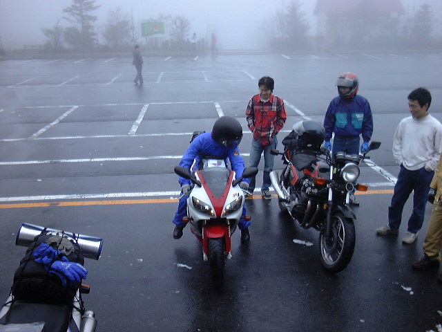 そんな状態なので速度は抑えめ。暫く走ると後ろから車が来た。 最初はkeijiかとおもったら全然違う車が後ろに迫ってくる。 我々に追い付いたその車は、霧だっつうのに 通常よりも車間詰めてくる。やな車。(-.-#凸