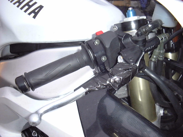 故障車が右側で、皆のバイクは左側に止まっており、 ちょっと他の車の通行のじゃまになっている。 そこで、左側に移動しようとするが動かない。ブレーキレバーが折れて 何処かに引っかかっているのか、フロントブレーキが効いているのだ。 プライヤーで外そうとするが全然駄目。 ブレーキオイル抜いたら?みたいな事を言って緩めようとするが、 取り敢えずその前に折れたレバーを外してみる。 押してみると動いたので、左側に移動させる。