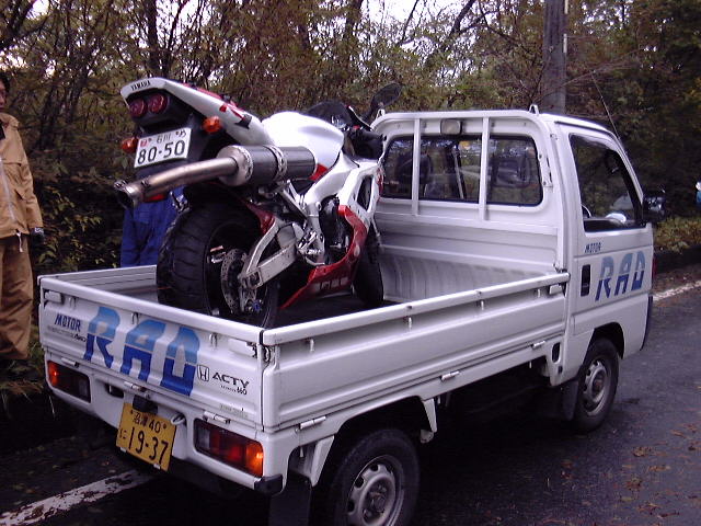 先行していて事故の事を知らないkeijiに電話し、状況を説明する。 なんたってわしの荷物も乗ってるから先に帰る訳にもいかず、 どっかで待ってるんだろう。すると、こっちに来ると。