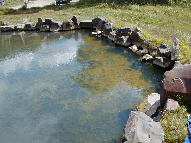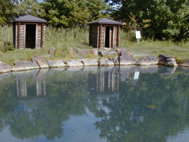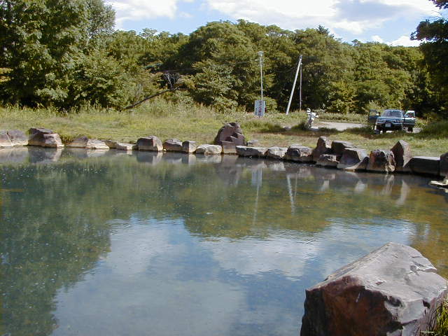 道道52から脇に逸れてすぐだった。途中に看板あるので分かりやすい。 向かって右側には脱衣場が2箇所ある。 湯面には小さな泡が立っているので初めは湧いているもしくは底から泡 が出ているのかと思ったが、実は湯舟には大量の藻が繁殖しており、光合成 による酸素だったようだ。その所為か湯自体もぬるぬるしていた。 一部に藻の少ない所があったので、そこに入浴したのだが、湯も温かった 入浴中および入浴後の間に車3台、自転車2台訪れたが入浴する者はいなかった。 |