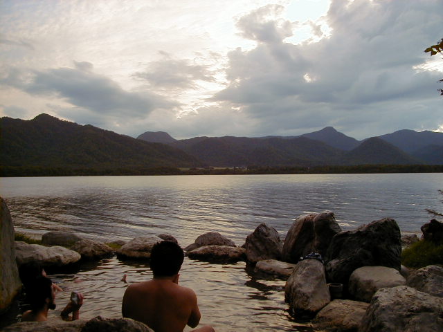 夕暮れ時に訪れた。露天は2つで、右が男性、左が女性となっているが、 仕切りはちょっと大きな岩だけである。その所為か、入浴している女性は 水着を着ていた。湯加減は、私にとってはやや温めな感じだったが、それ 位が丁度良く、のんびりと湯に浸かっる事が出来、とてもいい湯だった。 湯舟から10m程で湖なので、眺めはよい。さらに夕暮れ時だったので夕日も 綺麗だった。 |