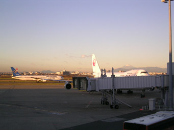 そうそう、一昨日羽田に降り立った時は、飛行機からタラップ降りてバスじゃなくて、へんな通路見たいので直接ターミナルビルに入れたのね。これって第2ターミナルができて第1が空いたからなのかなーと思ったら、今朝の出発は従来通りロビーからバスなんだよ。